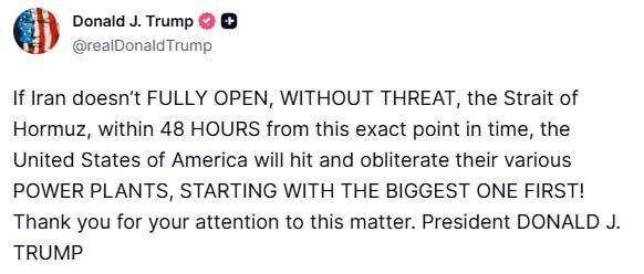 Ο πρόεδρος των ΗΠΑ, Ντόναλντ Τραμπ απείλησε – προειδοποίησε το Ιράν πως αν δεν ανοίξει τα Στενά του Ορμούζ σε 48 ώρες από την ανάρτησή του, θα χτυπήσει τα εργοστάσια παραγωγής ηλεκτρικής ενέργειας του Ιράν, «ξεκινώντας από το μεγαλύτερο».