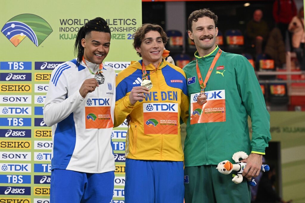 Οι τρεις πρώτοι στο επί κοντώ με τον αθλητή του Ολυμπιακού Εμμανουήλ Καραλή στο δεύτερο σκαλί του βάθρου