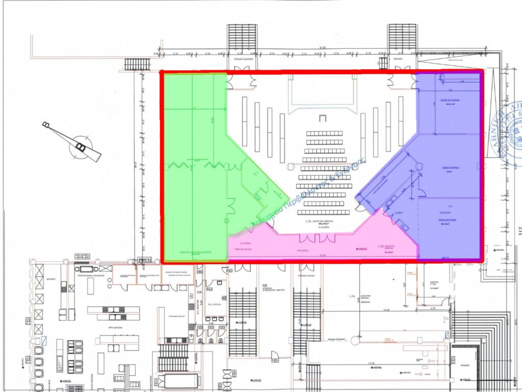 Συγκεκριμένα, όπως φαίνεται στην παρακάτω κάτοψη του χώρου του «Γαιόπολις», από την κύρια αίθουσα των 735 τ.μ. έχουν παραχωρηθεί: