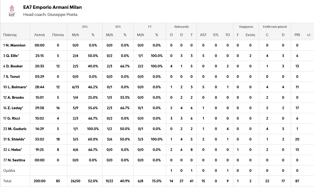 Πρώτος σκόρερ για τη Μονακό ήταν ο Ντιαλό που είχε 17 πόντους και 6 ριμπάουντ, αλλά κορυφαίος ήταν ο Οκόμπο με 16 πόντους και 13 ασίστ. Για το Μιλάνο κορυφαίος ήταν ο Σιλντς με 18 πόντους και 5 ριμπάουντ ενώ 16 πόντους με 6 ριμπάουντ είχε ο Λεντέι.