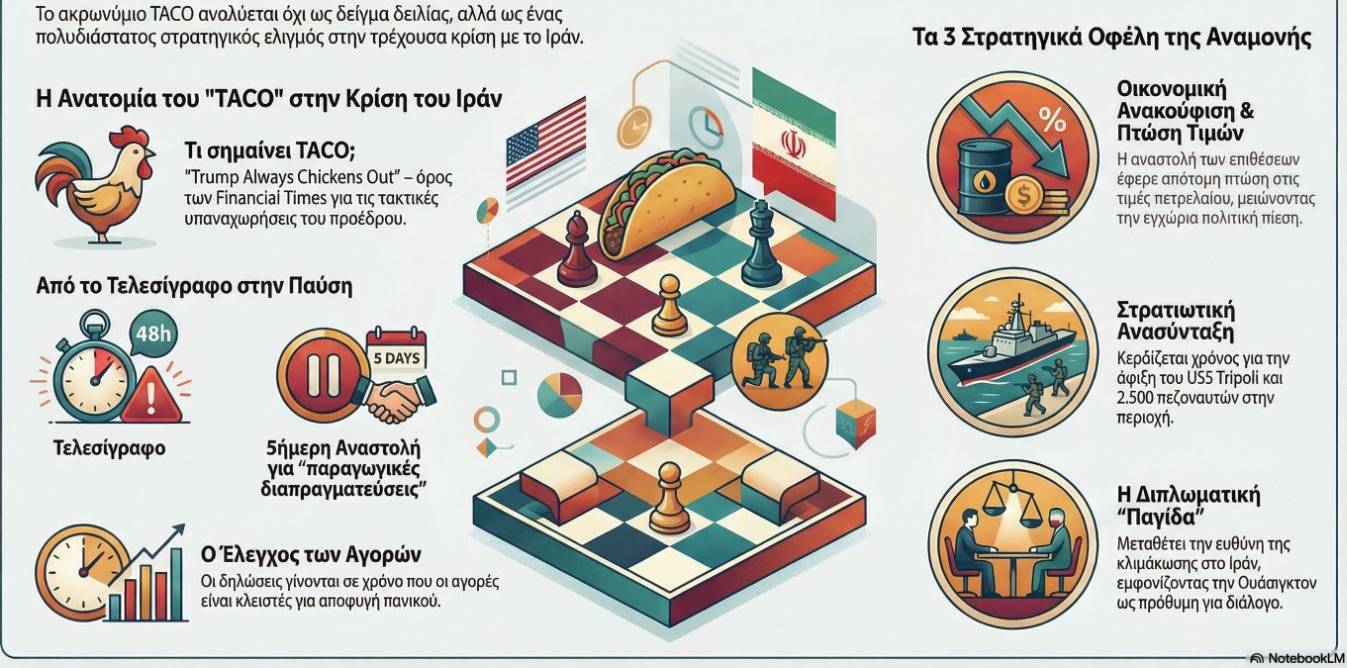Στους επικριτές του φαίνεται σαν ένα προσωρινό TACO. Ωστόσο, με την κίνηση αυτή, όλα δείχνουν πως κερδίζει πολύτιμο χρόνο σε μια σύγκρουση που οξύνεται.
