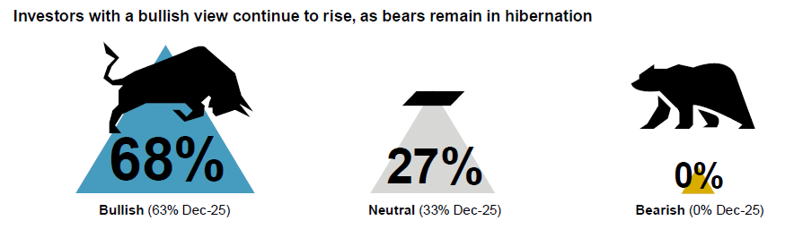 Η 23η έρευνα επενδυτικού κλίματος για τις αναδυόμενες αγορές της HSBC καταγράφει μάλιστα περαιτέρω ενίσχυση των θετικών προσδοκιών, με το 68% των συμμετεχόντων να δηλώνει αισιόδοξο για το επόμενο τρίμηνο, έναντι 63% τον Δεκέμβριο, ενώ για δεύτερη συνεχόμενη φορά δεν καταγράφηκαν αρνητικές εκτιμήσεις. Έτσι, ο καθαρός δείκτης επενδυτικού κλίματος διαμορφώνεται σε ιστορικό υψηλό 68%, σημειώνοντας τη 14η διαδοχική θετική μέτρηση.