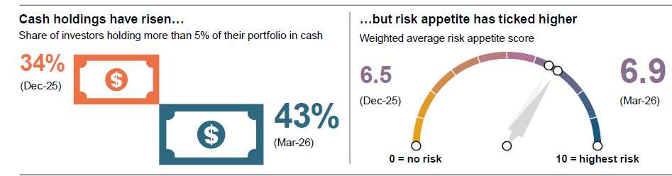 Η αυξημένη επιφυλακτικότητα μεταφράζεται και σε υψηλότερα επίπεδα ρευστότητας, με τα διαθέσιμα να αυξάνονται στο 4,7% των υπό διαχείριση κεφαλαίων. Παράλληλα, όμως, ενισχύεται και η πρόθεση αξιοποίησης αυτών των κεφαλαίων, καθώς περισσότεροι επενδυτές σχεδιάζουν να μειώσουν τα μετρητά τους, υιοθετώντας στρατηγική «αγορών στη διόρθωση» και όχι συνολικής απομόχλευσης κινδύνου.