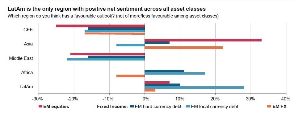 Σε ό,τι αφορά τις περιφερειακές επιλογές, η Λατινική Αμερική ξεχωρίζει ως η μόνη περιοχή με θετικό επενδυτικό κλίμα σε όλες τις κατηγορίες ενεργητικού, ενώ η Μέση Ανατολή καταγράφει επιδείνωση. Η Ασία παραμένει η πιο ελκυστική για μετοχές και νομίσματα, αν και το κλίμα για το χρέος σε τοπικό νόμισμα έχει επιδεινωθεί.