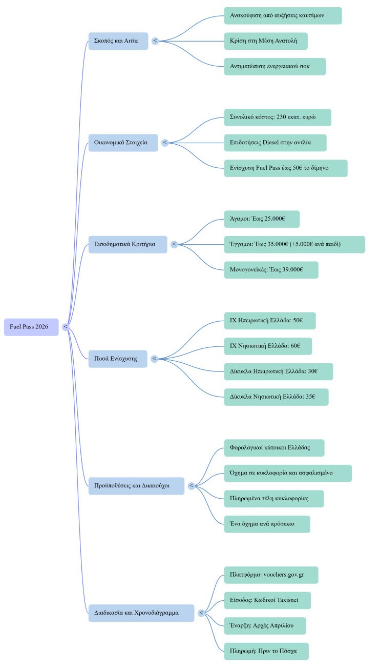 Η ελληνική κυβέρνηση επαναφέρει το Fuel Pass για το 2026, στοχεύοντας στον περιορισμό των επιπτώσεων από τις διεθνείς αυξήσεις στις τιμές των καυσίμων. Το πρόγραμμα προβλέπει οικονομική ενίσχυση έως 50 ευρώ για τους κατοίκους της ηπειρωτικής χώρας και έως 60 ευρώ για τους νησιώτες, με βάση συγκεκριμένα εισοδηματικά κριτήρια και την οικογενειακή κατάσταση των δικαιούχων