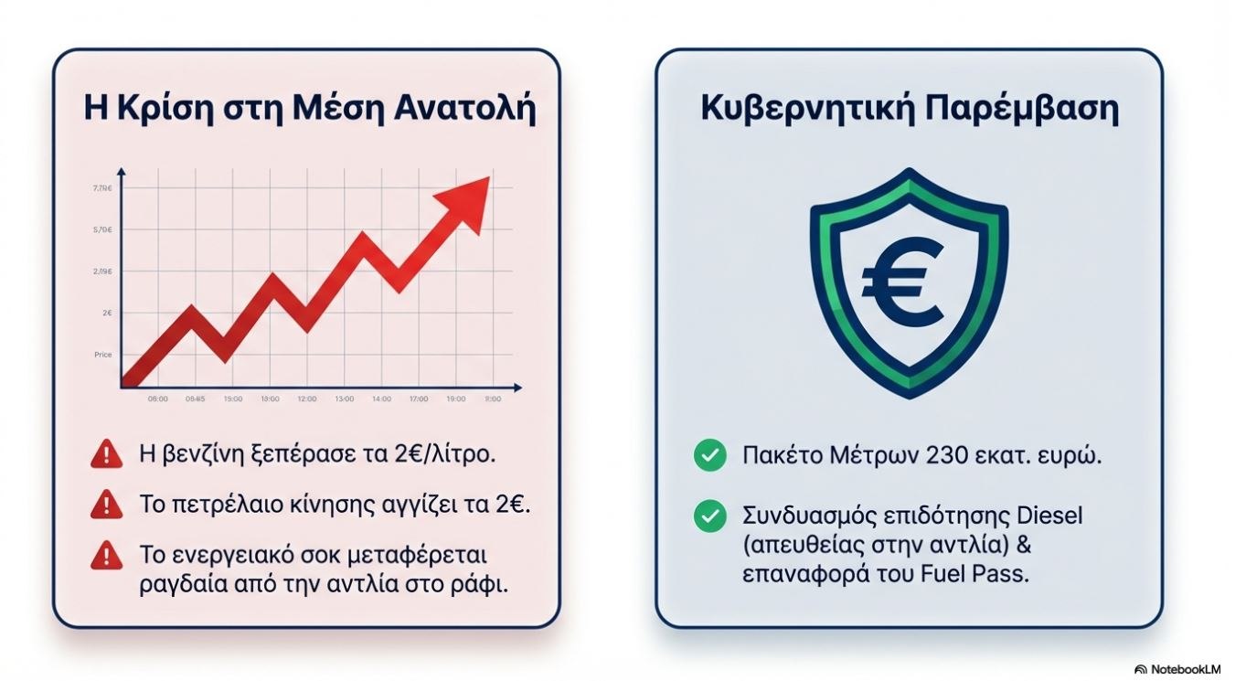 Τα μέτρα που ανακοινώθηκαν έρχονται με καθυστέρηση. Η βενζίνη έχει ήδη ξεπεράσει τα 2 ευρώ το λίτρο, το πετρέλαιο κίνησης κινείται κοντά στα 2 ευρώ και το ενεργειακό σοκ του πολέμου περνά με ταχύτητα από την αντλία στο ράφι.