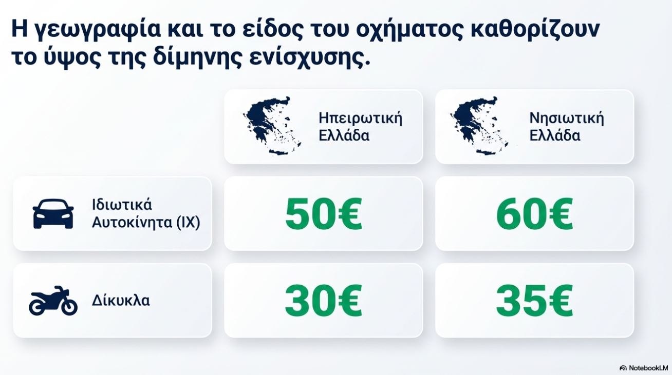 Για τους κατόχους δικύκλων το ποσό της επιδότησης διαμορφώνεται στα 30 και τα 35 ευρώ σε ηπειρωτική και νησιωτικής Ελλάδα, αντίστοιχα.