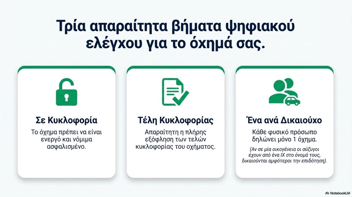 Διαδικασία: Είσοδος με κωδικούς Taxisnet, επιβεβαίωση στοιχείων οχήματος και επιλογή τρόπου πληρωμής.