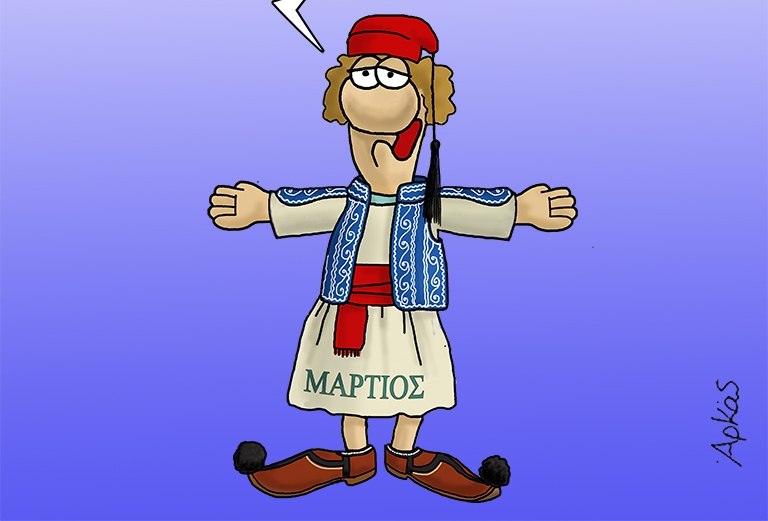 Στο σκίτσο, σε φόντο με διαβάθμιση μπλε, δεσπόζει στο πάνω μέρος η λέξη «ΚΑΛΗΜΕΡΑ». Στο κέντρο βρίσκεται μια φιγούρα ντυμένη με παραδοσιακή ελληνική φορεσιά, με φουστανέλα, μπλε γιλέκο, κόκκινο φέσι και τσαρούχια, ενώ πάνω στη φουστανέλα αναγράφεται «ΜΑΡΤΙΟΣ».