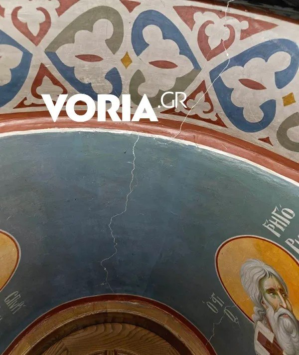 Δείτε φωτογραφία από ρωγμές που σχηματίστηκαν στον τρούλο του Ναού του Αντιπροσωπείου της Ιεράς Μονής Εσφιγμένου στις Καρυές, ο οποίος είναι αφιερωμένος στην Κοίμηση της Θεοτόκου:
