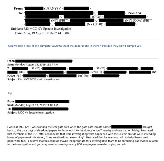Στις 19 Αυγούστου 2019 — λιγότερο από δύο εβδομάδες μετά τον θάνατο — υπάλληλος της φυλακής έστειλε email στο FBI αναφέροντας ότι κρατούμενος υποστήριξε πως μέλη της ερευνητικής ομάδας του Bureau of Prisons κατέστρεφαν έγγραφα που σχετίζονταν με την υπόθεση.