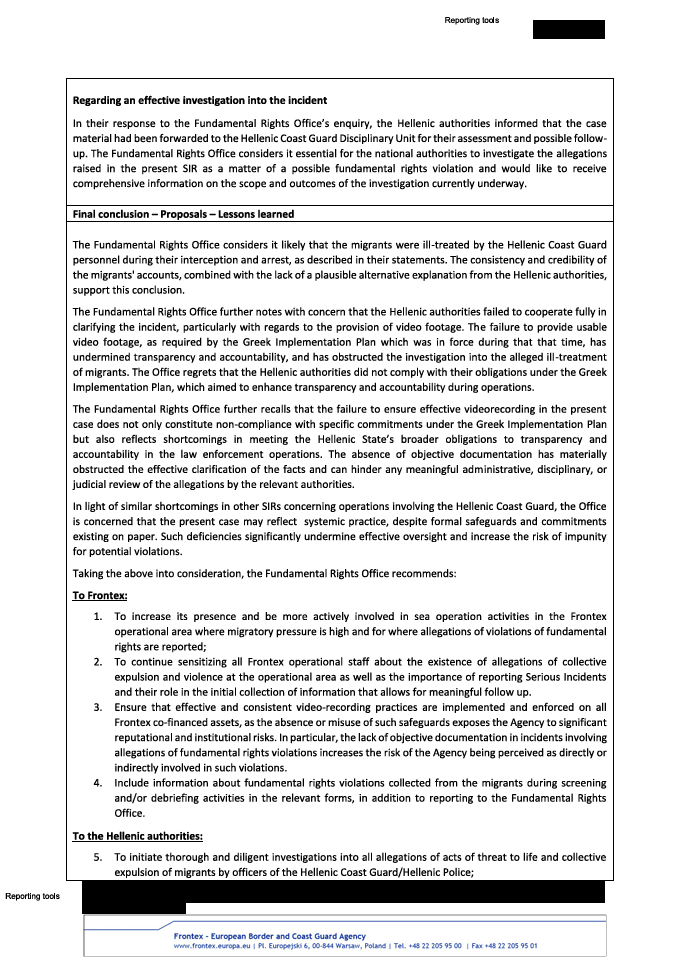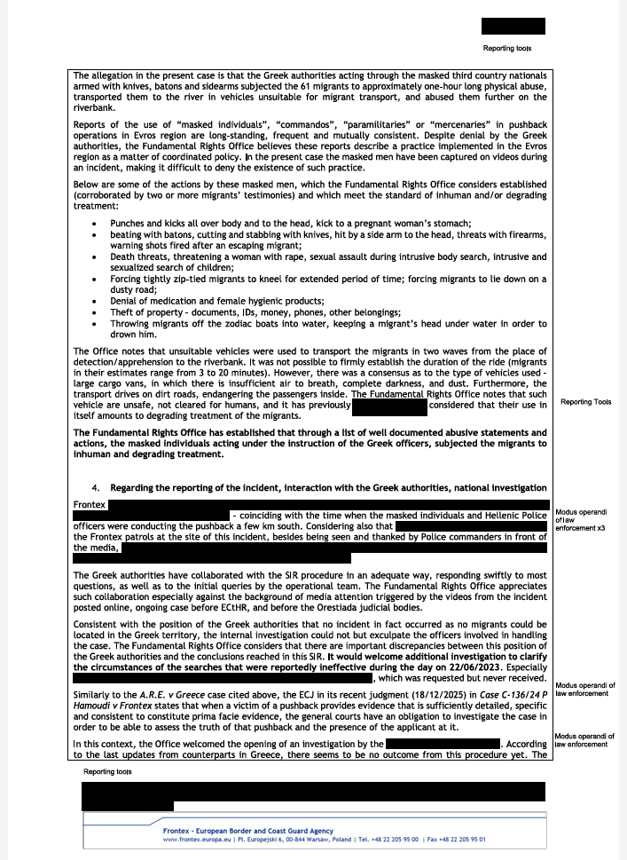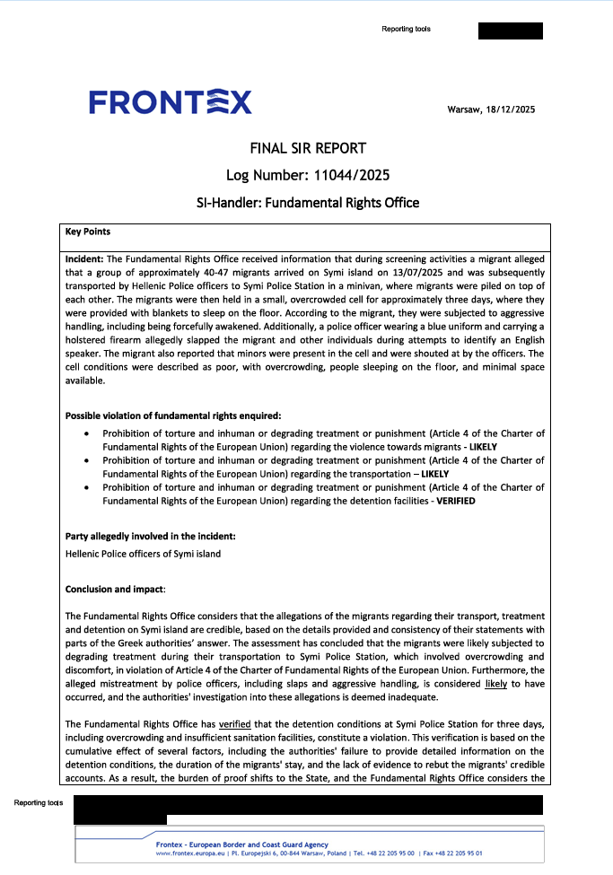 Οι τέσσερις Αναφορές Σοβαρού Συμβάντος (SIR) του Γραφείου Θεμελιωδών Δικαιωμάτων, της ανεξάρτητης αρχής που δρα στο εσωτερικό της Frontex και η οποία επιβλέπει τη συμμόρφωση της ευρωπαϊκής συνοριοφυλακής και των εθνικών σωμάτων ασφαλείας με τον Χάρτη Θεμελιωδών Δικαιωμάτων της ΕΕ, παραδόθηκαν στην υπηρεσία σε διάφορες ημερομηνίες από τις 18/12/2025 μέχρι τις 13/2/2026.