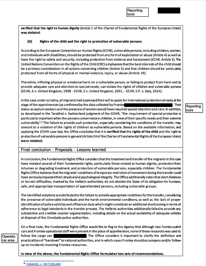 Η έρευνα του Γραφείου βρήκε ότι σε αυτό το περιστατικό παραβιάστηκαν τα δικαιώματα του παιδιού και των ευάλωτων ατόμων εν γένει, το δικαίωμα στην προστασία από απάνθρωπη και εξευτελιστική μεταχείριση και το δικαίωμα στην ανθρώπινη αξιοπρέπεια, όπως υπαγορεύονται από τον Χάρτη των Θεμελιωδών Δικαιωμάτων της ΕΕ. Ταυτόχρονα, οι συνθήκες μεταφοράς εκτιμάται ότι έθεσαν σε κίνδυνο τη σωματική και ψυχική ακεραιότητα των ανθρώπων.
