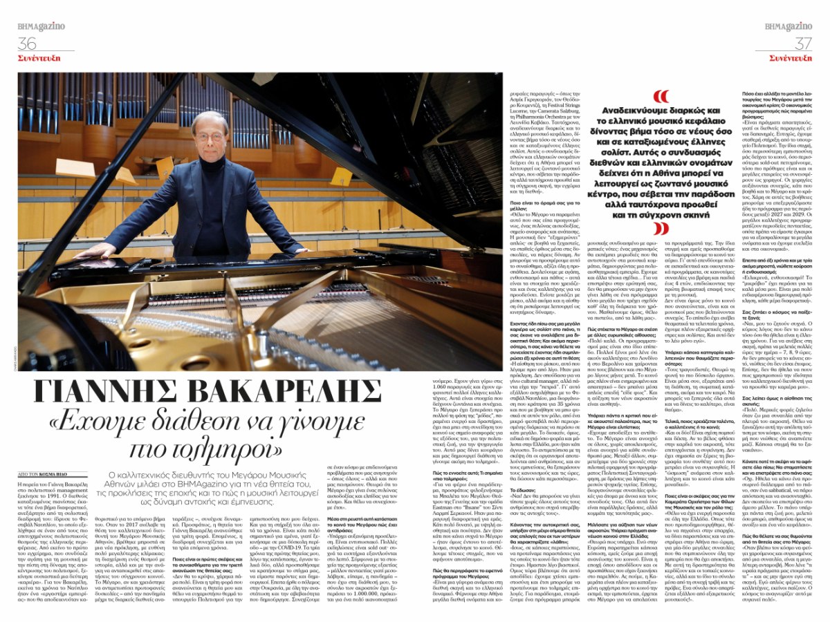 Στις σελίδες του περιοδικού, ο καλλιτεχνικός διευθυντής του Μεγάρου Μουσικής Αθηνών, Γιάννης Βακαρέλης, μιλά για τη νέα του θητεία, τη διάθεση για τόλμη και τον ρόλο της μουσικής ως δύναμης αντοχής και έμπνευσης σε μια απαιτητική εποχή.