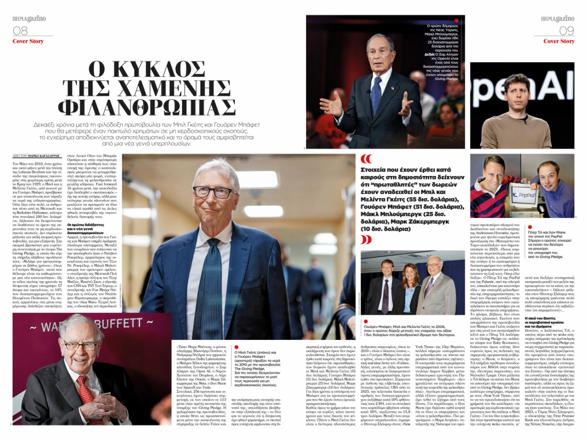 Αυτή την Κυριακή 29 Μαρτίου, το νέο τεύχος του περιοδικού BHMAGAZINO κυκλοφορεί με ΤΟ ΒΗΜΑ φιλοξενεί στο κεντρικό του θέμα τη μεγάλη έρευνα «Ο κύκλος της χαμένης φιλανθρωπίας» εξετάζοντας το όραμα που διατύπωσαν πριν από δεκαέξι χρόνια ο Bill Gates και ο Warren Buffett: μια φιλόδοξη πρωτοβουλία που υποσχόταν να διοχετεύσει τεράστιους πόρους σε μη κερδοσκοπικούς σκοπούς.