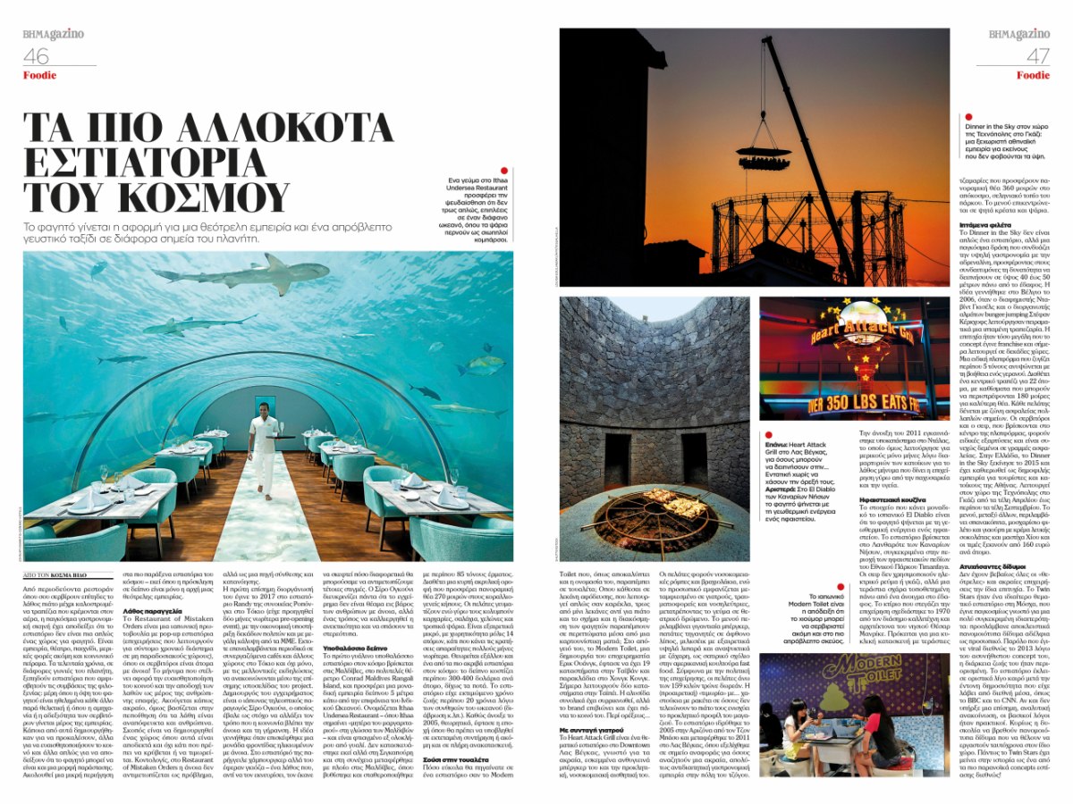 Από τα πιο αλλόκοτα εστιατόρια του κόσμου μέχρι τις πιο απρόβλεπτες γαστρονομικές εμπειρίες, το BHMAGAZINO ταξιδεύει τον αναγνώστη σε μια σειρά από προορισμούς όπου το φαγητό γίνεται θέαμα και αφήγηση.
