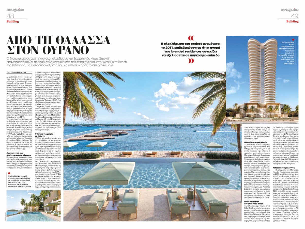 Στην αρχιτεκτονική, ο διεθνώς καταξιωμένος Moshe Safdie επαναπροσδιορίζει την έννοια της πολυτελούς κατοικίας στο West Palm Beach της Φλόριντα, σχεδιάζοντας έναν ουρανοξύστη που συνδέει αρμονικά τον ουρανό με τη θάλασσα.