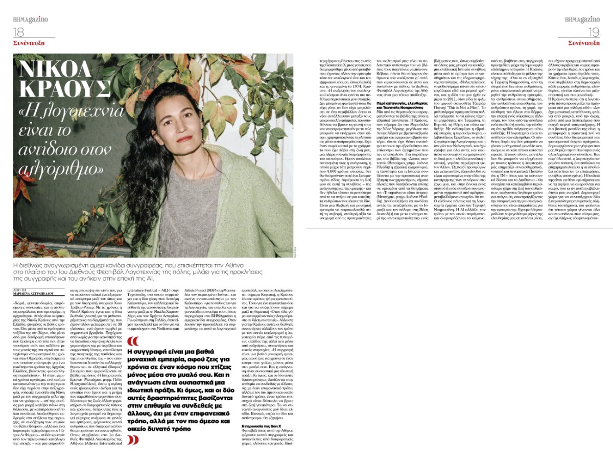 Στον χώρο της λογοτεχνίας, η Nicole Krauss μιλά για τη συγγραφή στην εποχή της τεχνητής νοημοσύνης, υποστηρίζοντας πως η λογοτεχνία παραμένει το ουσιαστικό αντίδοτο στον αλγόριθμο.