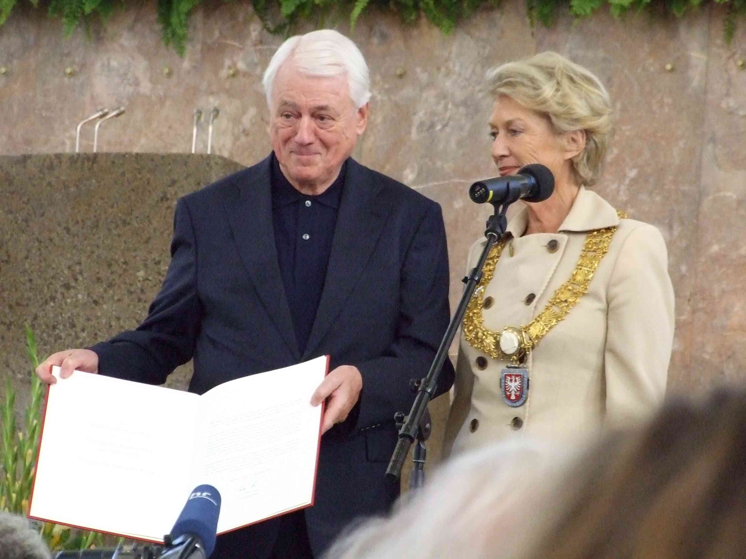 Ο Αλεξάντερ Κλούγκε λαμβάνει το βραβείο «Theodor-W.-Adorno-Preis» (2009) από την Πέτρα Ροτ, στην Paulskirche της Φρανκφούρτη, Γερμανία. Πηγή: Wikimedia