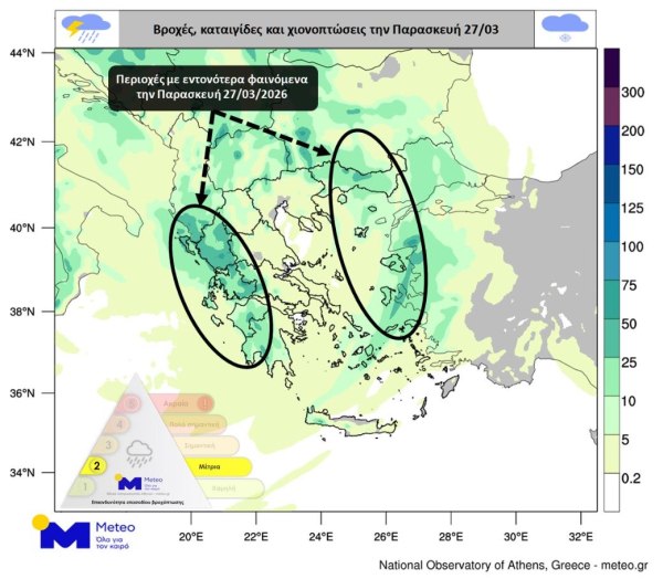 Στον προγνωστικό χάρτη παρουσιάζεται ο αθροιστικός υετός (βροχοπτώσεις/χιονοπτώσεις) που αναμένεται κατά τη διάρκεια της Παρασκευής 27/03.