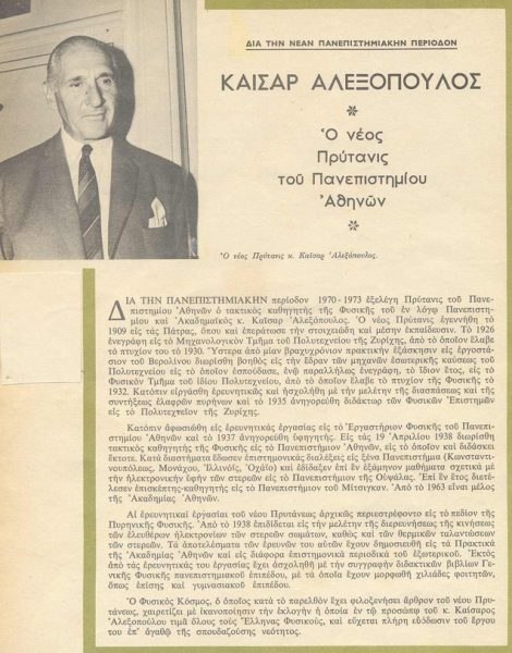 Στις 27 Μαρτίου 2010 απεβίωσε υπερεκατοντούτης ο ακαδημαϊκός Καίσαρ Αλεξόπουλος, διακεκριμένος φυσικός, ομότιμος καθηγητής του Πανεπιστημίου Αθηνών και επί 35 συναπτά έτη διευθυντής του Εργαστηρίου Φυσικής του αρχαιότερου πανεπιστημιακού ιδρύματος της χώρας.