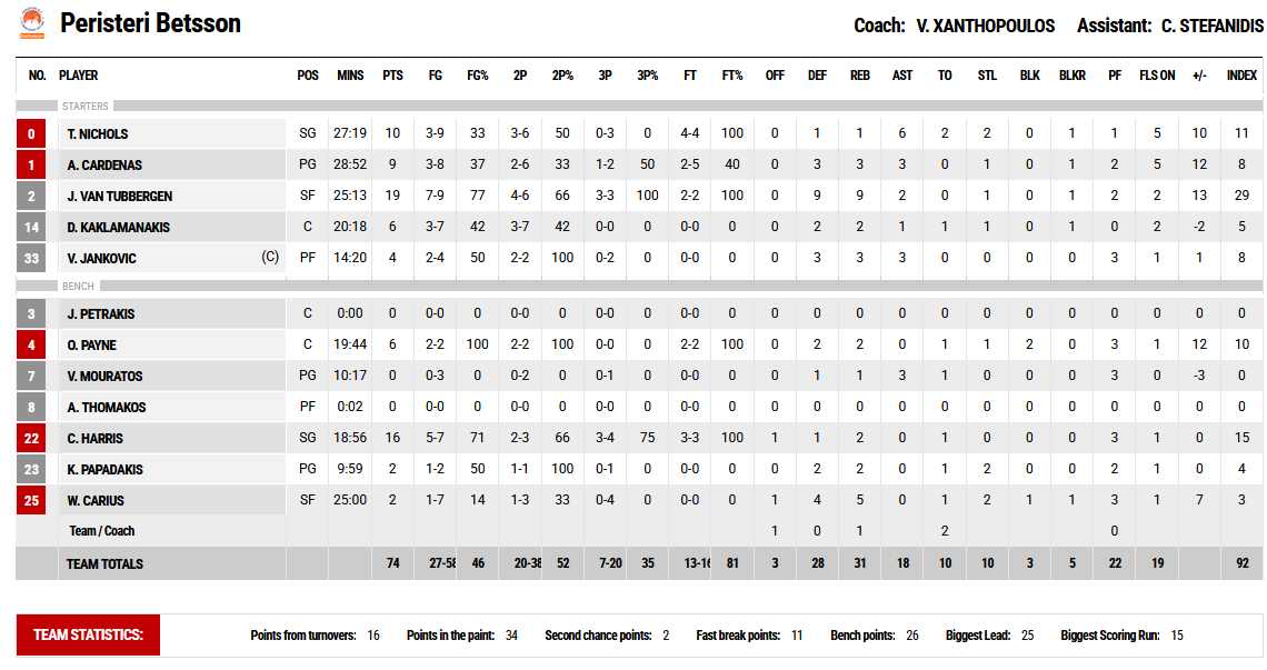 Η ΑΕΚ προηγήθηκε με 8-5 στα πρώτα τρία λεπτά και έκτοτε δεν βρέθηκε ξανά μπροστά στο σκορ. Με τρίποντο του Χάρις το Περιστέρι Betsson βρέθηκε στο +6 (10-16, 7′) και πήγε στο ημίχρονο με το σκορ στο 28-35.