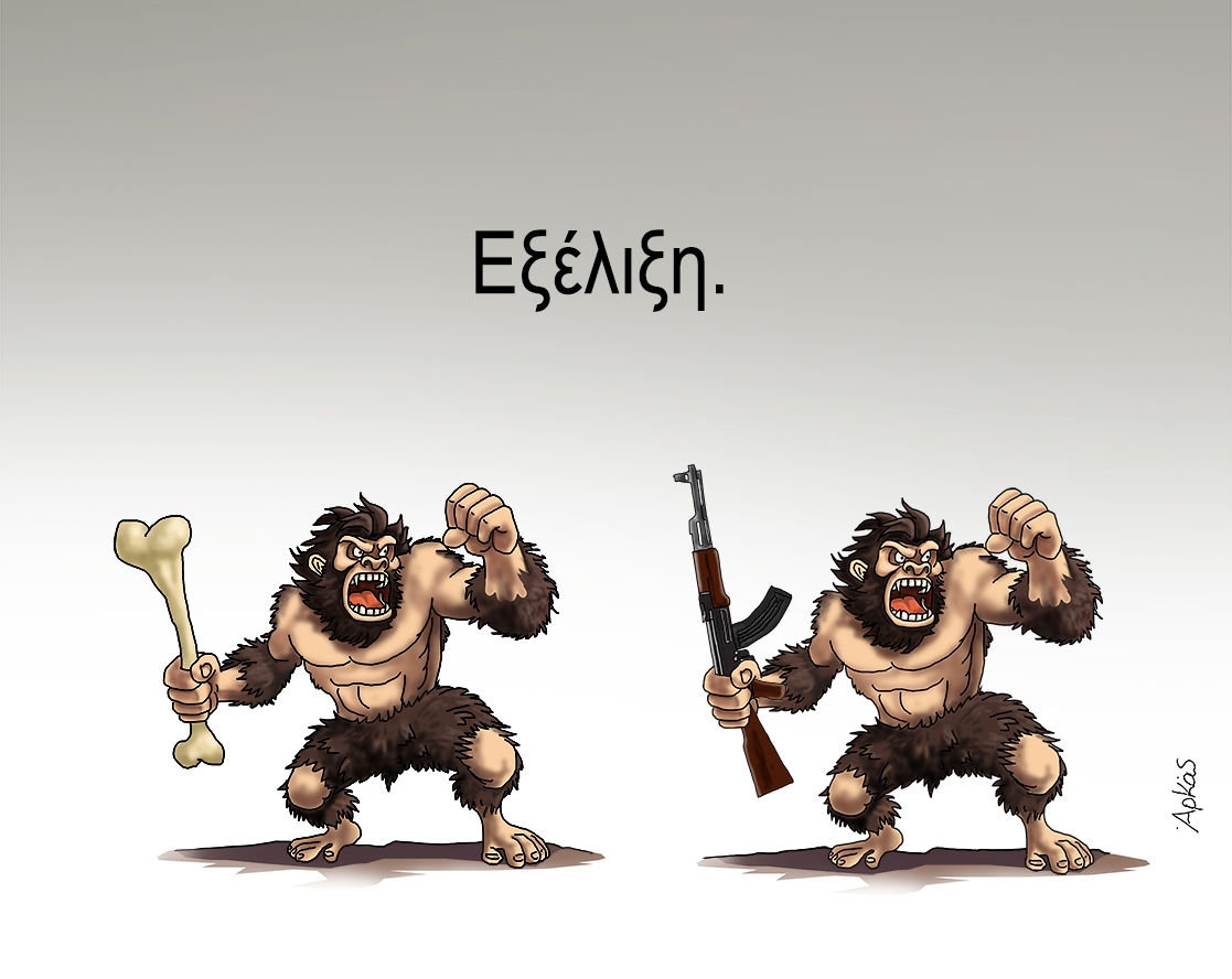 Την καλημέρα του μας λέει και σήμερα ο γνωστός σκιτσογράφος Αρκάς με τον τρόπο του. Στη σημερινή εικόνα βλέπουμε έναν πρωτόγονο άνθρωπο σε δύο εκδοχές: στην πρώτη κρατά ένα κόκαλο, ενώ στη δεύτερη ένα σύγχρονο όπλο. Πάνω από τη σκηνή δεσπόζει η λέξη «Εξέλιξη».