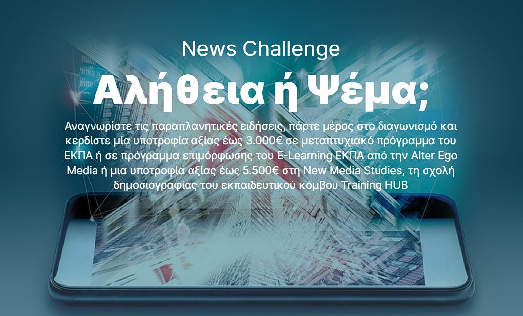Με ιδιαίτερη επιτυχία ολοκληρώθηκε ο διαγωνισμός «News Challenge: Αλήθεια ή Ψέμα;», μια πρωτοβουλία του ομίλου Alter Ego Media που υλοποιήθηκε σε συνεργασία με το Εθνικό και Καποδιστριακό Πανεπιστήμιο Αθηνών και με την υποστήριξη του Γραφείου του Ευρωπαϊκού Κοινοβουλίου στην Αθήνα, επιβεβαιώνοντας τη σημασία της ενίσχυσης της κριτικής σκέψης στην εποχή της ψηφιακής πληροφόρησης.