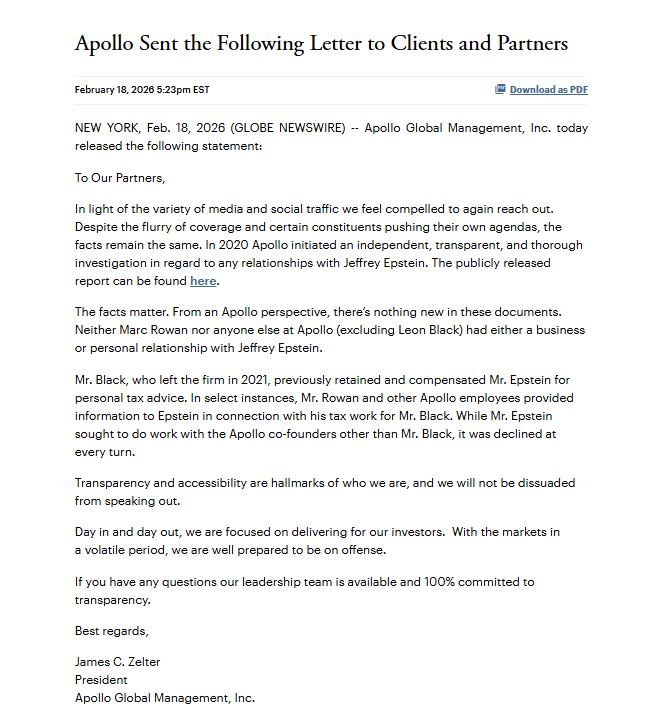 Την ίδια ώρα, δύο συνδικάτα εκπαιδευτικών — με συνολικές επενδύσεις τουλάχιστον 27,5 δισ. δολαρίων στην Apollo Global Management — απευθύνθηκαν σε ομοσπονδιακές αρχές, ζητώντας να διερευνηθεί αυτό που χαρακτηρίζουν ως «έλλειψη ειλικρίνειας» από την πλευρά της εταιρείας.