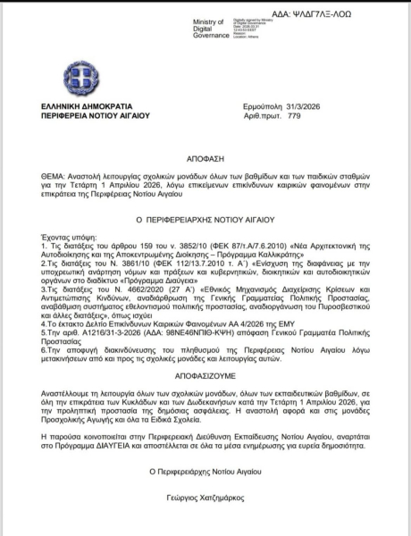 «Με απόφαση του Περιφερειάρχη Νότιου Αιγαίου αναστέλλεται η λειτουργία όλων των σχολικών μονάδων , όλων των εκπαιδευτικών βαθμίδων σε όλη την Επικράτεια των Κυκλάδων & Δωδεκανήσων».