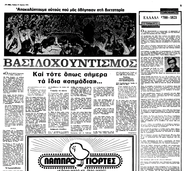 Το αν μη τι άλλο ενδιαφέρον άρθρο του (τίτλος του, «Ελλάδα 1700-1821»), βασισμένο στη μελέτη του Βασίλη Κρεμμυδά «Εισαγωγή στην ιστορία της νεοελληνικής κοινωνίας 1700-1821», είχε δημοσιευτεί στην εφημερίδα «Τα Νέα» την Τετάρτη 31 Μαρτίου 1976.