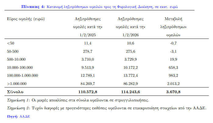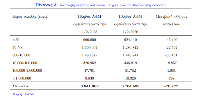 Αναφορικά με τον συνολικό αριθμό των οφειλετών, στο τέλος Ιανουαρίου του 2026 παρατηρείται μείωση κατά 76.777 πρόσωπα (φυσικά και νομικά) σε σχέση με την αντίστοιχη περίοδο του 2025 με αποτέλεσμα να διαμορφώνεται στους 3.764.592 οφειλέτες.