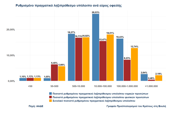 Το υψηλότερο ποσοστό των συνολικών ρυθμισμένων οφειλών (18,01%) εντοπίζεται στο εύρος 10.000 με 100.000 ευρώ, ενώ εντός αυτού του εύρους το ποσοστό των ρυθμισμένων οφειλών αγγίζει το 19,23% για ποσά από 20.001 έως 50.000 ευρώ.