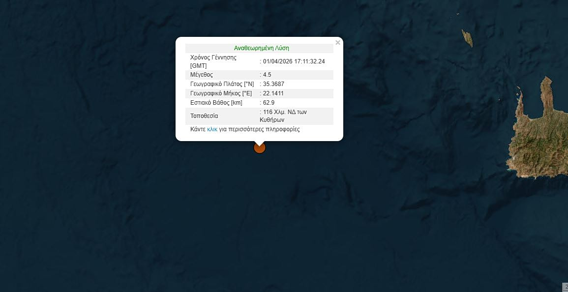 Το επίκεντρο καταγράφεται 116 χλμ νοτιοδυτικά των Κυθήρων.