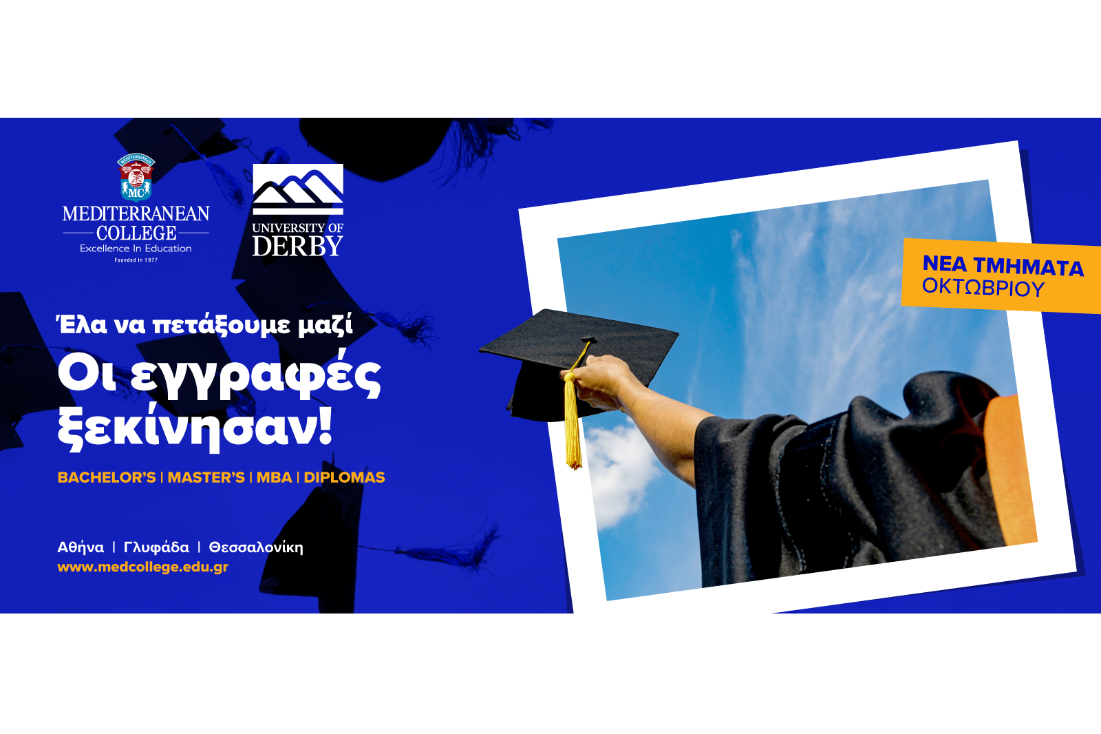 Κάποιες αποφάσεις παίρνονται σε λίγα δευτερόλεπτα. Κι όμως, μπορούν να αλλάξουν ολόκληρη την πορεία της ζωής και της καριέρας σου. Μια τέτοια απόφαση είναι να επενδύσεις στις σπουδές σου. Να επιλέξεις ένα αναγνωρισμένο Bachelor, Master ή MBA που θα σου ανοίξει πραγματικές επαγγελματικές προοπτικές. Στο Mediterranean College (MC) έχεις την ευκαιρία να κάνεις ακριβώς αυτό και μάλιστα να ξεκινήσεις με ένα σημαντικό πλεονέκτημα.