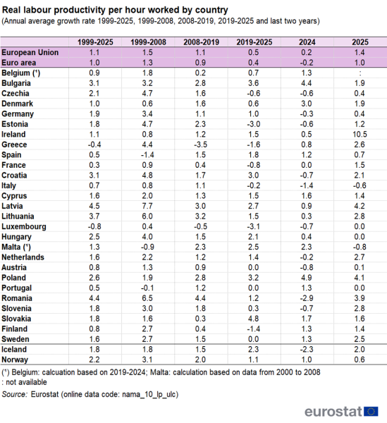 Η μεγαλύτερη άνοδος στην πραγματική παραγωγικότητα της εργασίας σημειώθηκε στην Ιρλανδία, με αύξηση 10,5% ανά εργατοώρα το 2025. Σύμφωνα με τη Εurostat η αύξηση αυτή οφείλεται στις δραστηριότητες των πολυεθνικών επιχειρήσεων, ιδίως της Βig Tech, οι οποίες εξακολουθούν να βρίσκουν στην Ιρλανδία έναν βολικό φορολογικό παράδεισο. Γι’αυτό και οικονομολόγοι αποκαλούν εν μέρει «τεχνητή» την υψηλή παραγωγικότητα της Ιρλανδίας, αφού αν διαχωρίσεις τις εγχώριες επιχειρήσεις από τις πολυεθνικές, η εικόνα αλλάζει.