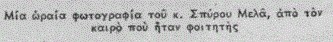 Στην κεντρική φωτογραφία του παρόντος άρθρου, πορτρέτο του Σπύρου Μελά διά χειρός Π. Βυζάντιου (πηγή: «Ο ΤΑΧΥΔΡΟΜΟΣ», 26.11.1955, Ιστορικό Αρχείο «ΤΟ ΒΗΜΑ» & «ΤΑ ΝΕΑ»).
