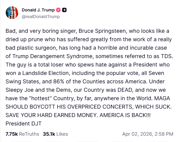 Με μια σειρά από αναρτήσεις το πρωί της Πέμπτης στο Truth Social, ο πρόεδρος των ΗΠΑ Ντόναλντ Τραμπ εξαπέλυσε σφοδρή επίθεση στον Σπρίνγκστιν, αποκαλώντας τον «ξεραμένο δαμάσκηνο» (για ακόμη μια φορά) και υποστηρίζοντας ότι «πάσχει από χρόνια και ανίατη μορφή Σύνδρομου Παράνοιας Κατά Του Τραμπ».