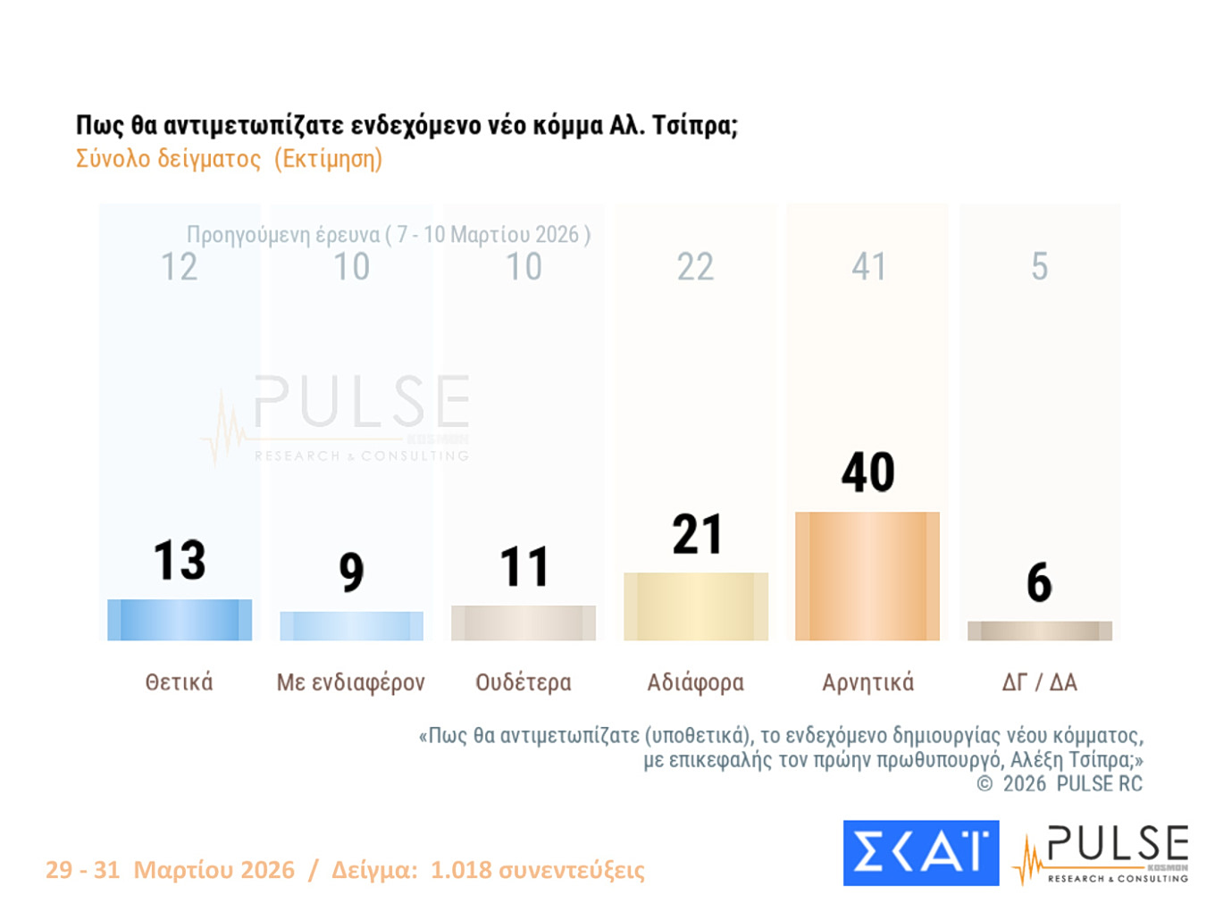 Την πρόθεση ψήφου, τα μέτρα στήριξης της κυβέρνησης λόγω του πολέμου, το συνέδριο του ΠΑΣΟΚ αλλά και την πρόθεση στήριξης στα υπό ίδρυση κόμματα με επικεφαλής τον Αλέξη Τσίπρα, την Μαρία Καρυστιανού και τον Αντώνη Σαμαρά «μετρά» δημοσκόπηση της Pulse που παρουσίασε ο ΣΚΑΪ.