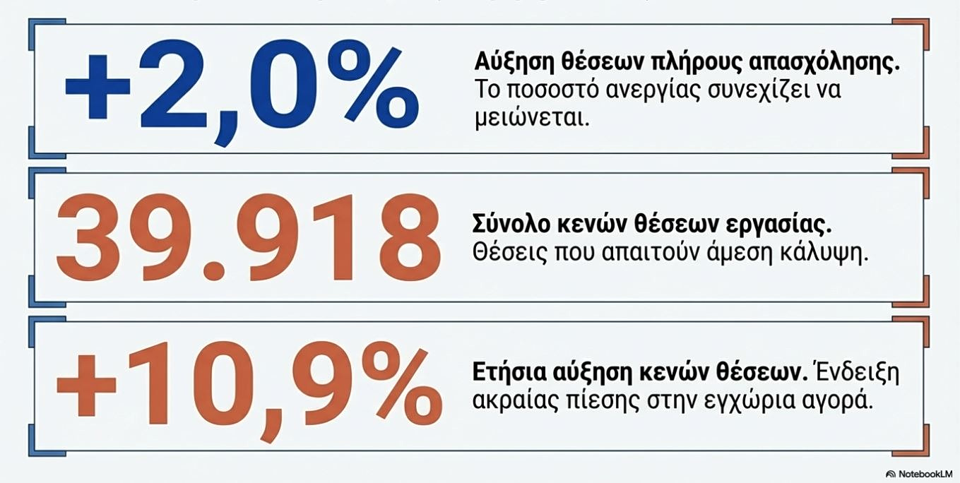 Η ελληνική αγορά εργασίας στις αρχές του 2026 παρουσιάζει έντονη δυναμική, με την ανεργία να υποχωρεί και τις θέσεις πλήρους απασχόλησης να ενισχύονται σημαντικά. Παρά τη θετική αυτή πορεία, καταγράφεται μια ραγδαία αύξηση των κενών θέσεων εργασίας