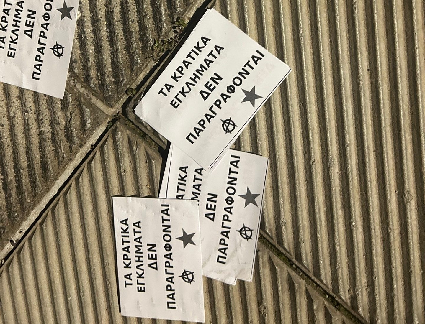 Ομάδα κουκουλοφόρων, δέκα ατόμων, έγραψε το σύνθημα «Τα κρατικά εγκλήματα δεν παραγράφονται» σε τοίχο του σπιτιού του πρώην δικαστικού λειτουργού και πέταξε τρικάκια.