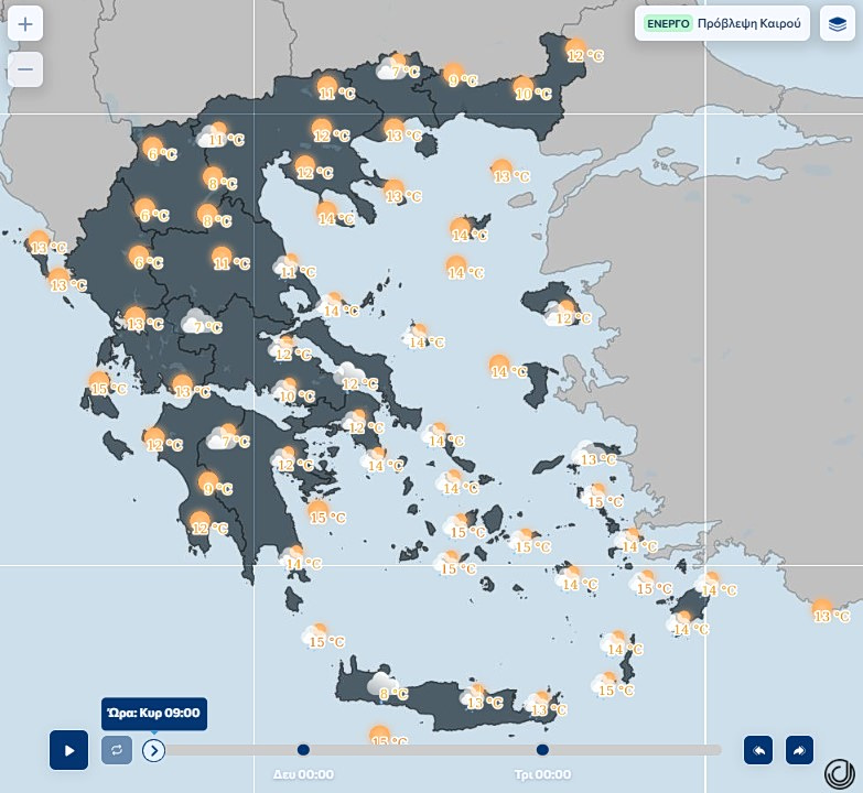 Θερμοκρασία: Από 07 έως 19 με 20 βαθμούς Κελσίου. Στη δυτική Μακεδονία 3 με 4 βαθμούς χαμηλότερη.
