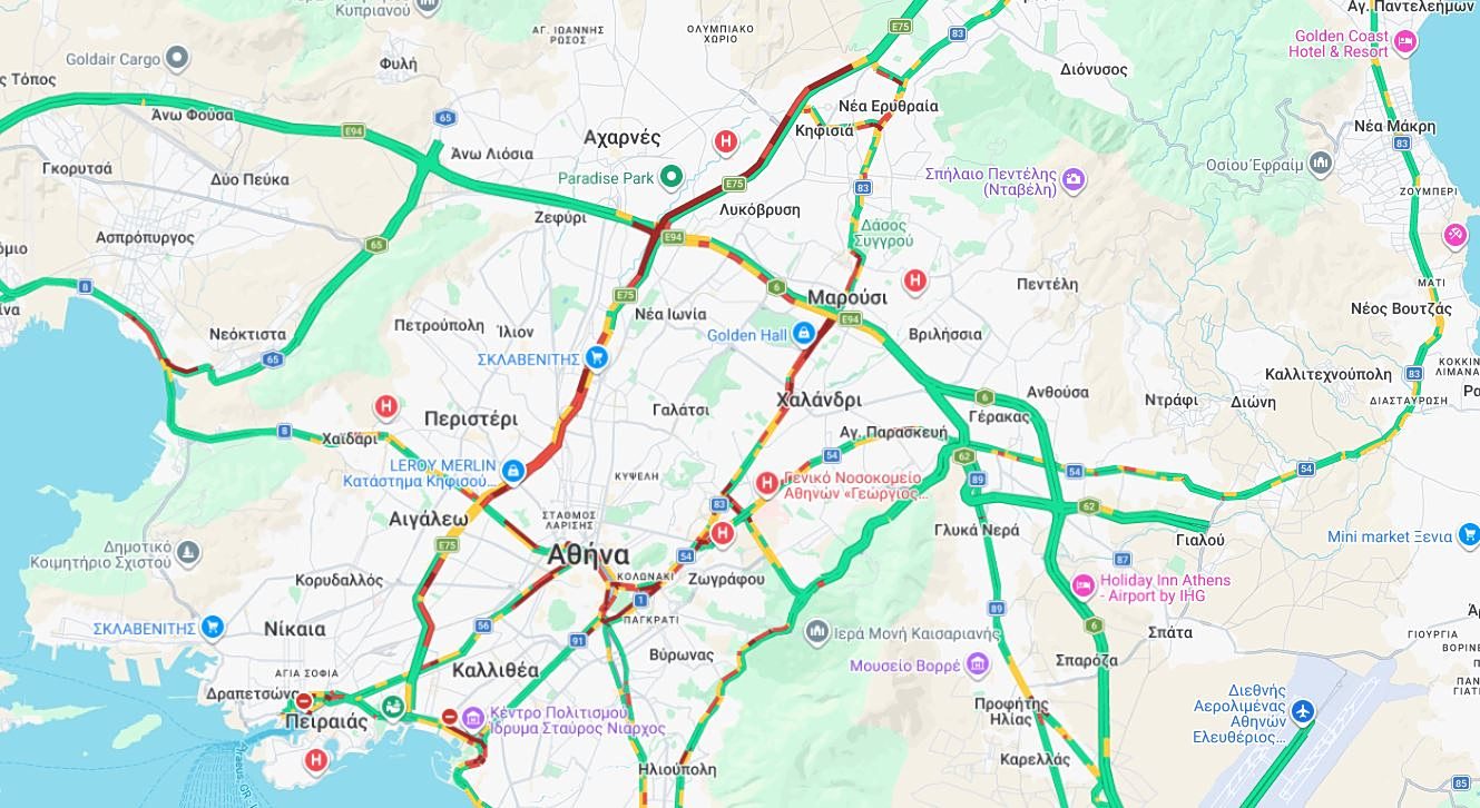 Αυξημένη είναι η κίνηση επίσης στη λεωφόρο Κηφισίας κοντά στο Χαλάνδρι, τη λεωφόρο Μεσογείων, την Κατεχάκη, την Παραλιακή στο ύψος του Φαλήρου και στους δρόμους του κέντρου της Αθήνας.