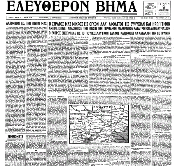 Τ’ ομολογούσε προχθές ο ίδιος στη ραδιοφωνική εκπομπή του. «Ο γερμανικός λαός», έλεγε ο ραδιοφωνητής του σταθμού του Βερολίνου, «δεν πρέπει ν’ αναμένη κεραυνοβόλον πόλεμον εις τα όρη. Τα στρατεύματά μας δρώσι εις τραχείαν χώραν. Οι λαοί εναντίον των οποίων μαχόμεθα υπήρξαν πάντοτε σκληραγωγημένοι μαχηταί. Τα Βαλκάνια αποτελούν πολεμικόν θέατρον εντελώς διαφορετικόν από τα προηγούμενα εις την Ανατολήν και εις την Δύσιν».