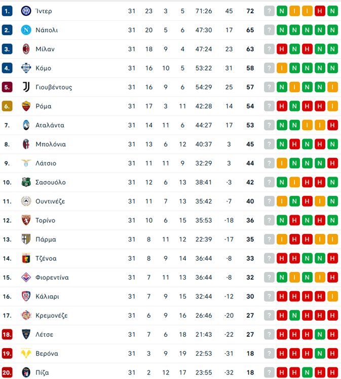 Τα αποτελέσματα της 31ης αγωνιστικής:
