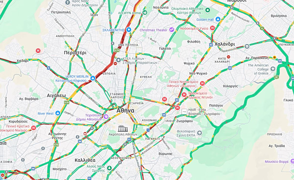 Αυξημένη είναι η κίνηση σε Μεσογείων, Κηφισίας, Συγγρού, Καλιρρόης, Αρδηττού, Βασ. Σοφίας, Βασ. Κωνσταντίνου, Αλεξάνδρας, Κατεχάκη.