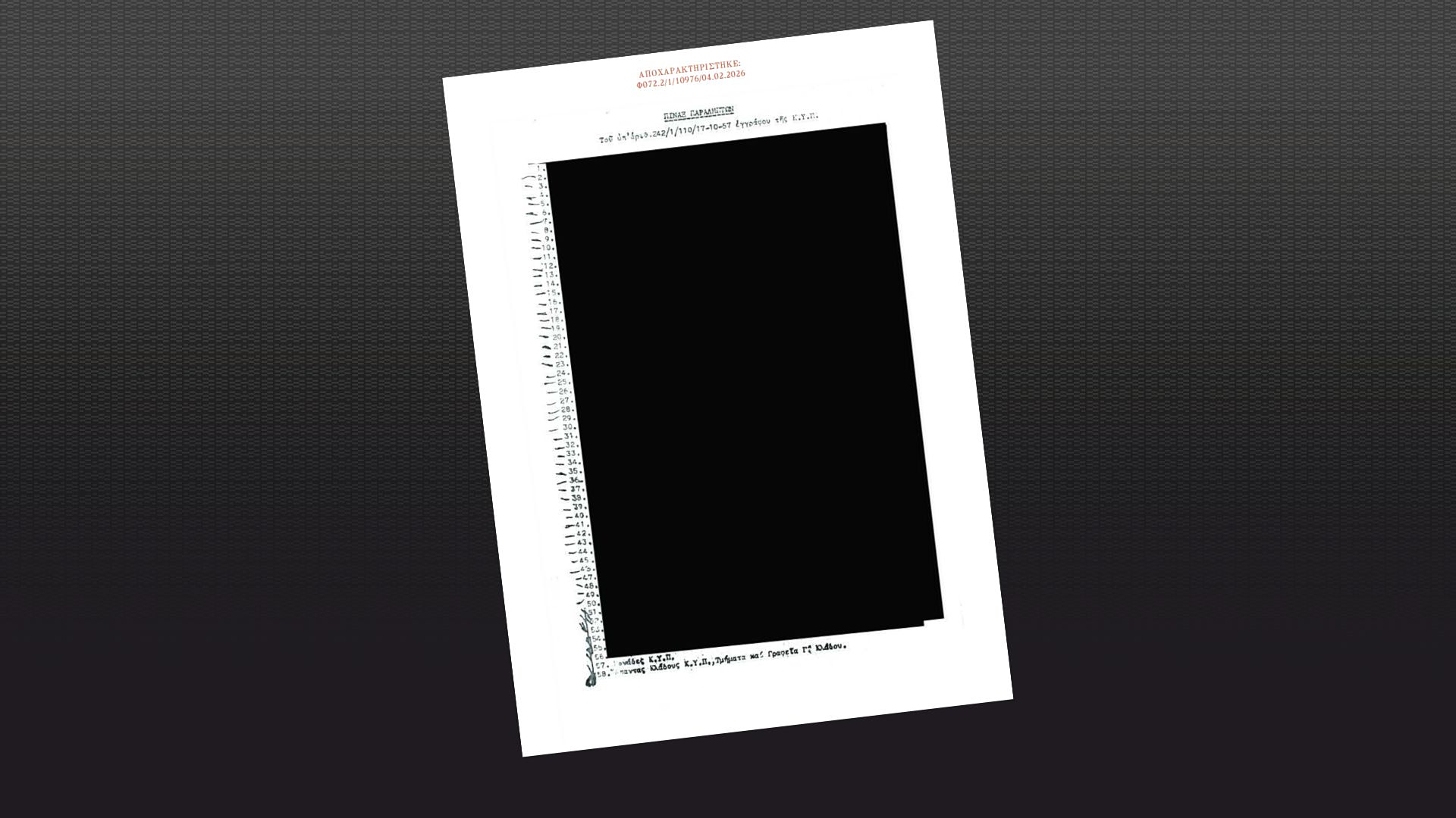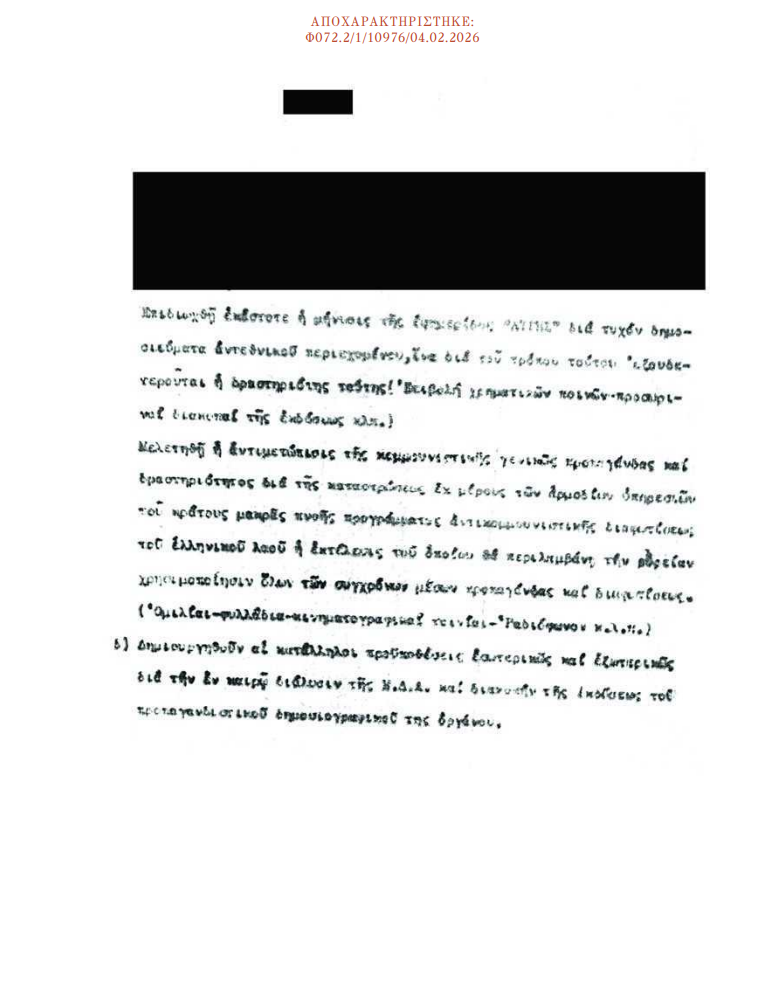 Στη σχετική σελίδα όμως του αποχαρακτηρισμένου εγγράφου που έδωσε η ΕΥΠ στη δημοσιότητα, η πρόταση για εξουδετέρωση των κορυφαίων στελεχών της ΕΔΑ από την Αστυνομία έχει αποκρυφτεί.