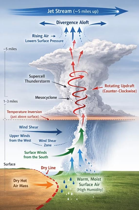 Διάτμηση ανέμου: Οι επιφανειακοί άνεμοι από τον νότο και οι ανώτεροι άνεμοι από τη δύση δημιουργούν μια οριζόντια κυλιόμενη κίνηση στην ατμόσφαιρα. Όταν ο αέρας ωθείται προς τα πάνω, αυτή η περιστροφή γίνεται κάθετη, δημιουργώντας αυτό που είναι γνωστό ως μεσοκυκλώνας.