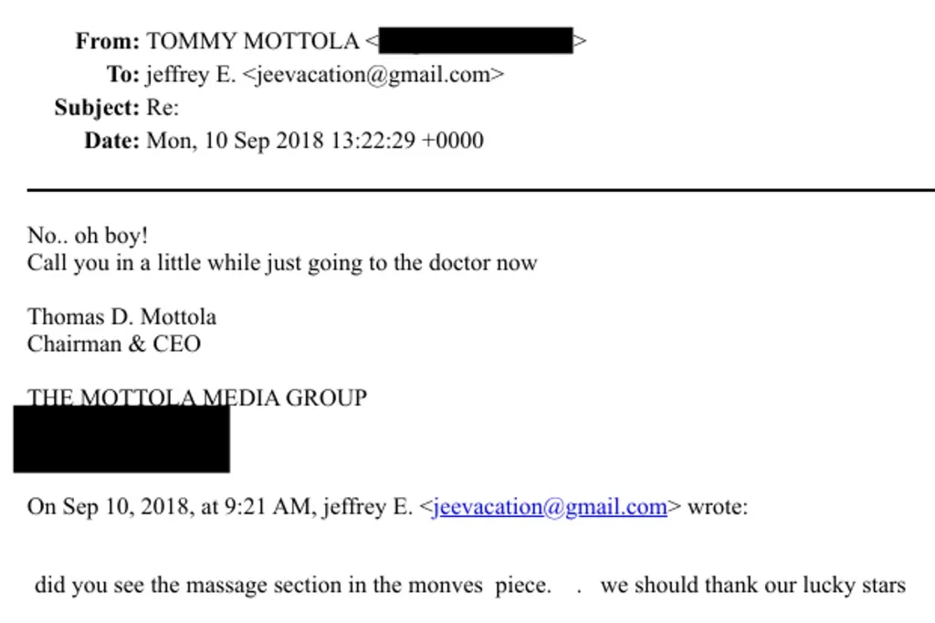 Μέσα σε αυτό το πλαίσιο ισχύος εμφανίζεται ο Τζέφρι Έπσταϊν, ο καταδικασμένος παιδοβιαστής και μαστροπός, που κατάφερε να χτίσει ένα δίκτυο ισχυρών επαφών, από πολιτικούς και επιχειρηματίες έως δημόσια πρόσωπα στη βιομηχανία της ψυχαγωγίας. Η πρόσφατη δημοσιοποίηση πάνω από 3 εκατομμυρίων εγγράφων του Υπουργείου Διακιοσύνης των ΗΠΑ φέρνει στο φως τις επικοινωνίες του Μοτόλα με τον Έπσταϊν από το 2004 μέχρι τον Ιούνιο του 2019, λίγες εβδομάδες πριν τη σύλληψη και τον θάνατο του Έπσταϊν, σύμφωνα με το Rolling Stone.