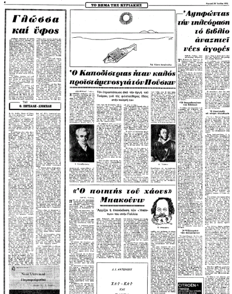 Στο φύλλο του «Βήματος» που είχε κυκλοφορήσει στις 30 Ιουλίου 1972, ημέρα Κυριακή, ο Θανάσης Πετσάλης-Διομήδης είχε εκθέσει τις απόψεις του για δύο έννοιες ασφαλώς συγγενικές, αλλά κατά βάθος ξεχωριστές: τη γλώσσα και το ύφος.